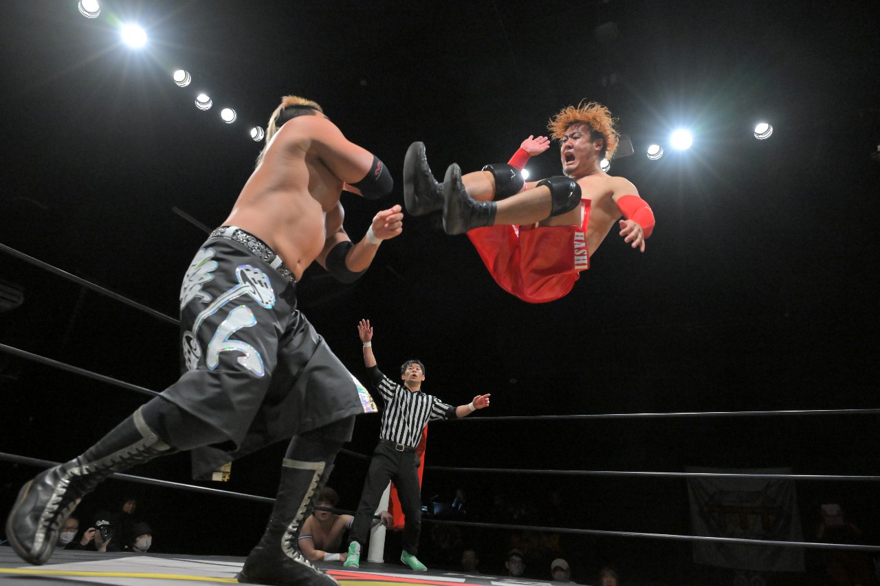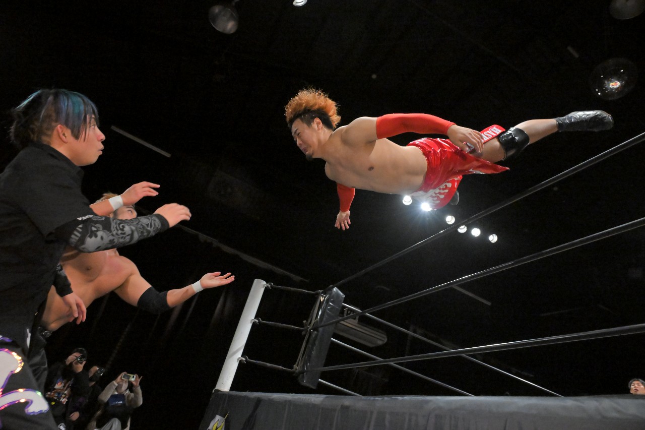 橋之介が飛び出していくと愛人タッグが2人でロープに振っていくが、橋之介はダブル攻撃をかわして神野へラリアット、中野へドロップキック、神野へヒップトスからの側転低空ドロップキックと連撃して2人を場外へと叩き出す。さらにノータッチ・トペ・コンヒーロで飛び込んで大ダメージを与えるが、橋之介も足を痛めたようでしばらくリングに上がれず。