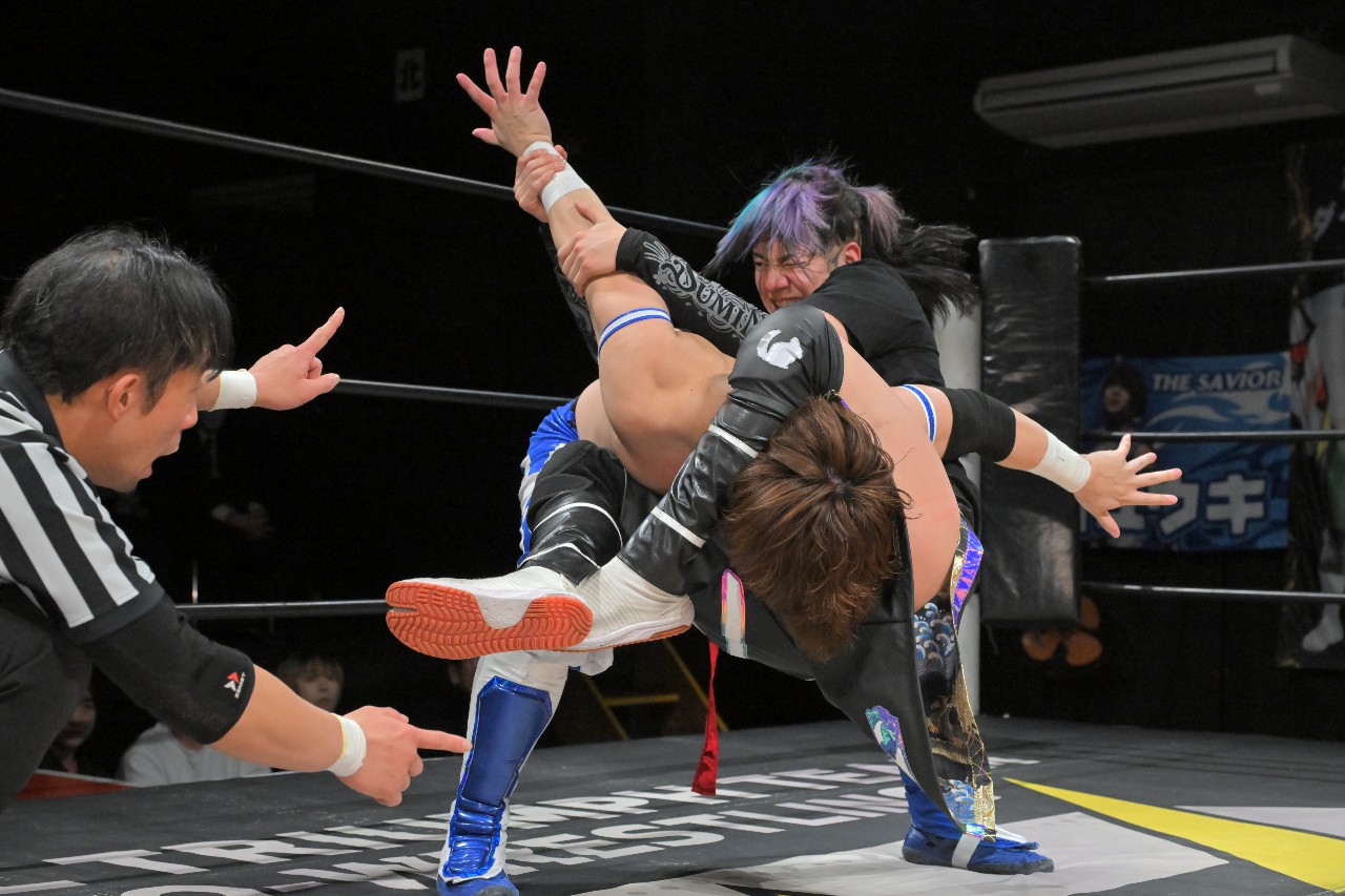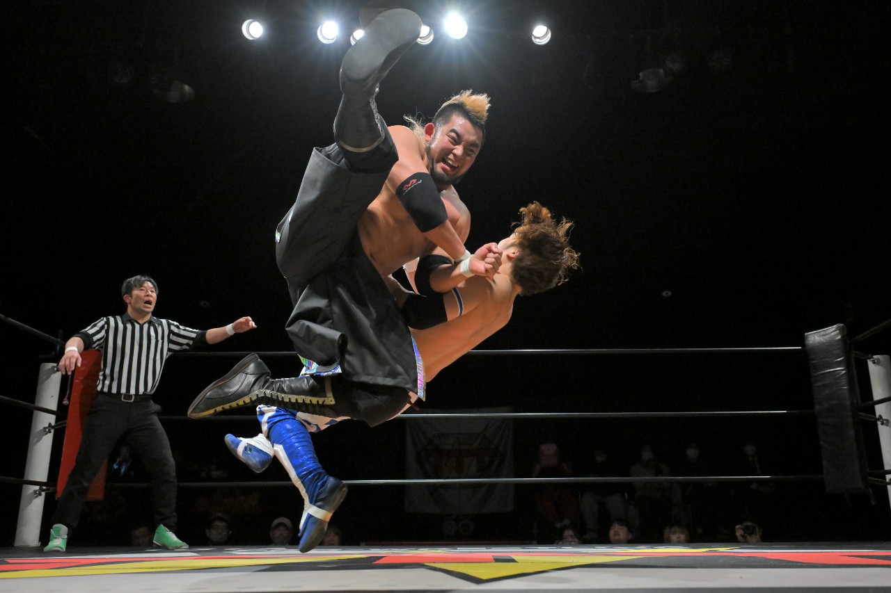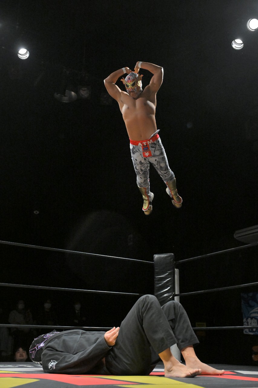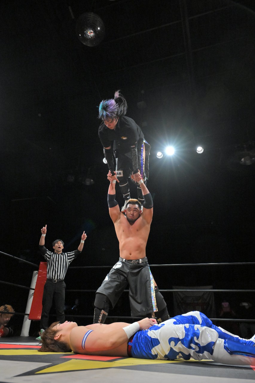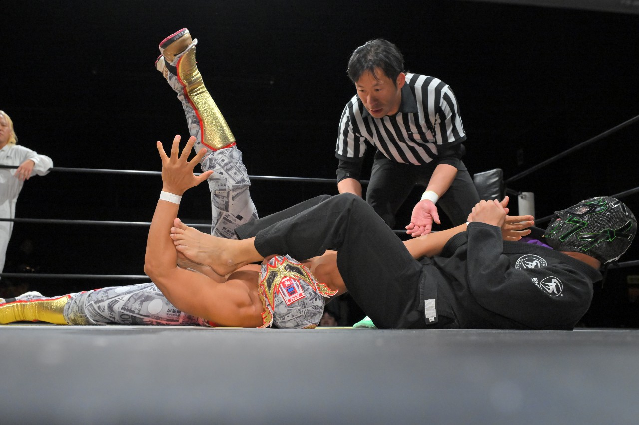 綾斗はミステリーに河津掛けからブレーンバスターを狙うが、ミステリーが逆にブレーンバスター。さらにミステリーが串刺しラリアットを狙うが、綾斗がトニー(綾斗ニー)で切り返してランネク(ランニング・ネックブリーカー・ドロップ)。