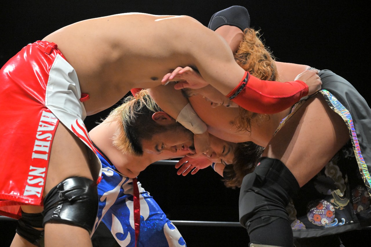 神崎は橋之介とともに中野をロープに振り、ダブルのヒップトスから神崎のボディプレス+橋之介のその場飛びムーンサルト・プレス。神崎がエルボーバッド連打でコーナーに押し込んで顔面を蹴りつけていき、ロープに振ってからのスリーパーホールド。振り払おうとする中野へコブラツイストで絡みついていくが、中野もなんとかロープを掴む。