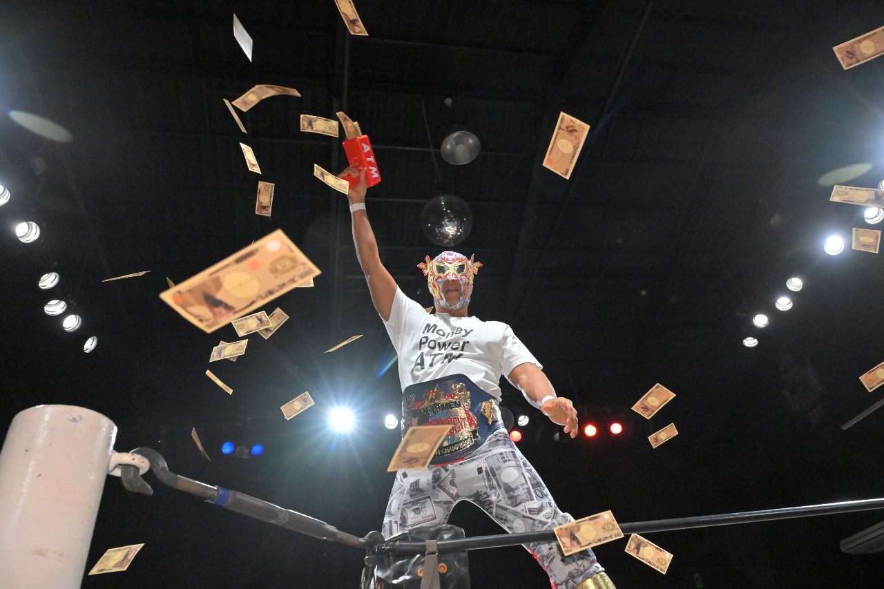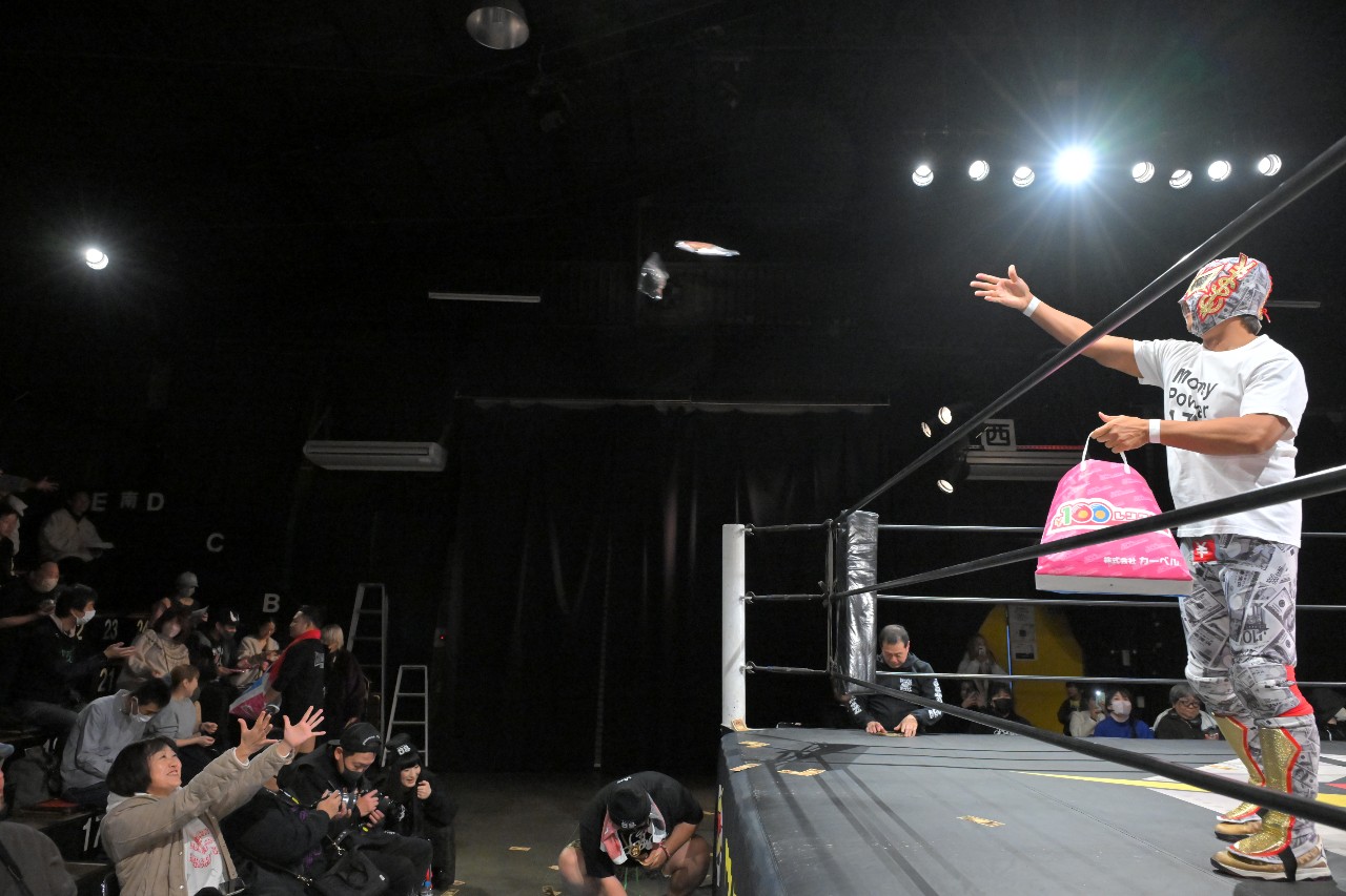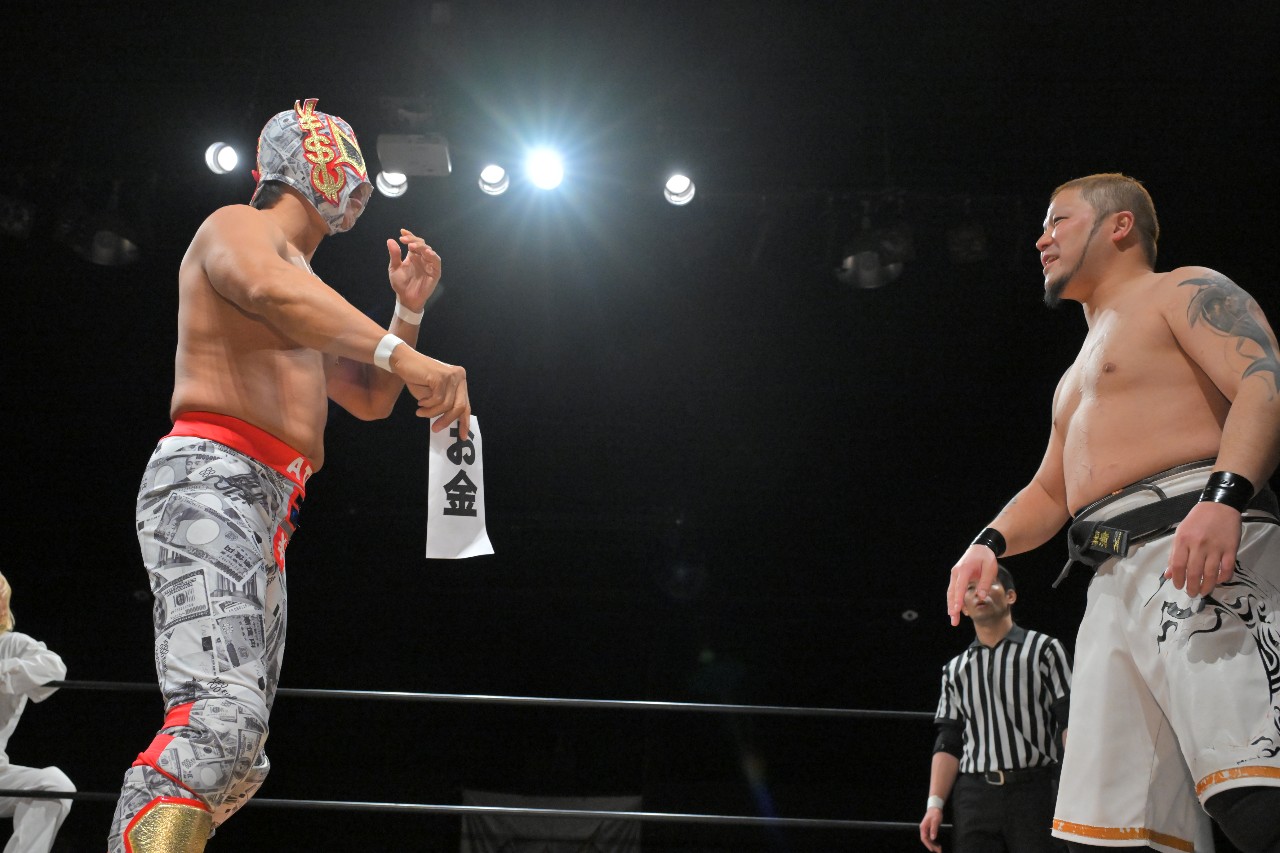 塚本は「いらない!お前、こないだも言ったけど、お金よりプロレスなんだよ!」と固辞。ATMが「全員に聞いてみろ」と促し、塚本が「お金よりプロレスですよねぇ?!」と問うと観衆は拍手で支持。