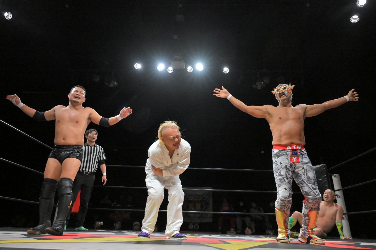 3人で「A!T!M!」とポーズを取ろうとするが、マネーパワーが無い佐野の腕が治るわけもなく激痛にのたうち回る。そんな様子を見たレフェリーが試合を止め、レフェリーストップ裁定で試合は終わった。