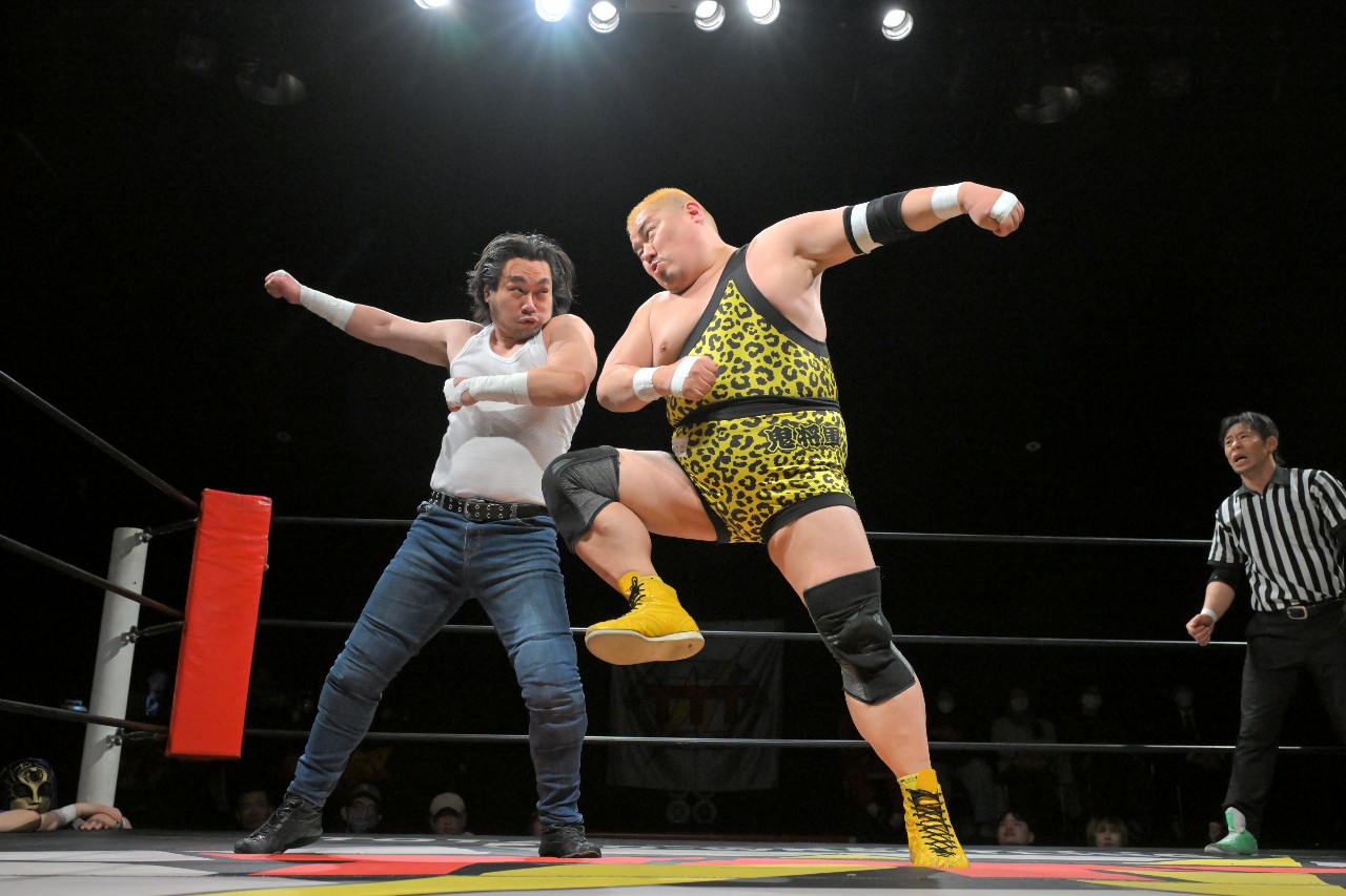 ガッツは左腕への鬼神ナックル連打から串刺しラリアットを狙うが、大家がビッグブーツで止めてミサイルキックで追撃。大家のミサイルキックもまた珍しく見る技であり、ガッツも意表を突かれた様子。