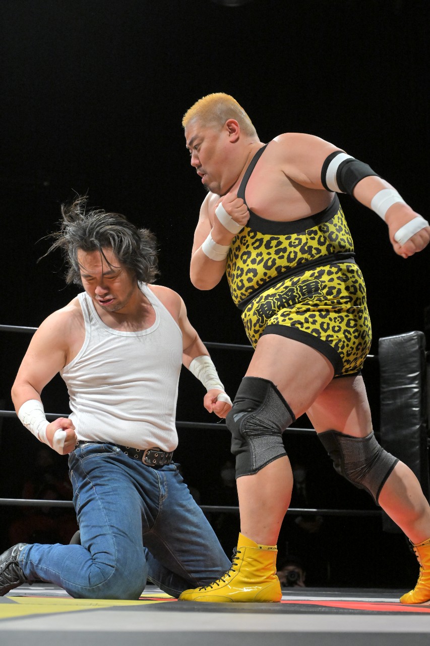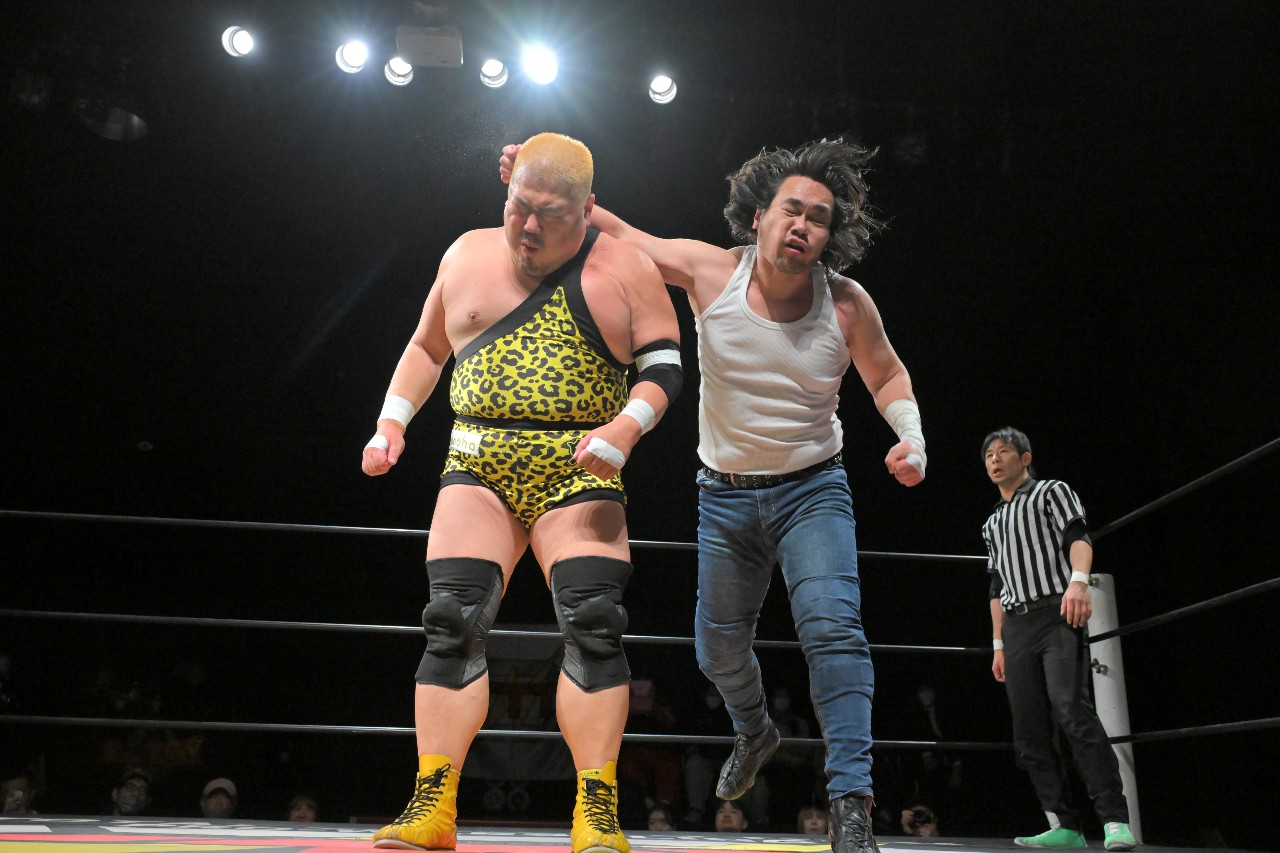 絶好の攻撃チャンスだが、大家が選んだのはガッツが立ち上がるのを待ってからのショルダータックルでの真っ向勝負。互いに一歩も退かないぶつかり合いから、ラリアットの正面衝突へと発展。幾度もの撃ち合いを優位に進めたのはガッツだったが、大家はカウンターのラリアットをクリーンヒットさせて逆転の狼煙を上げる。