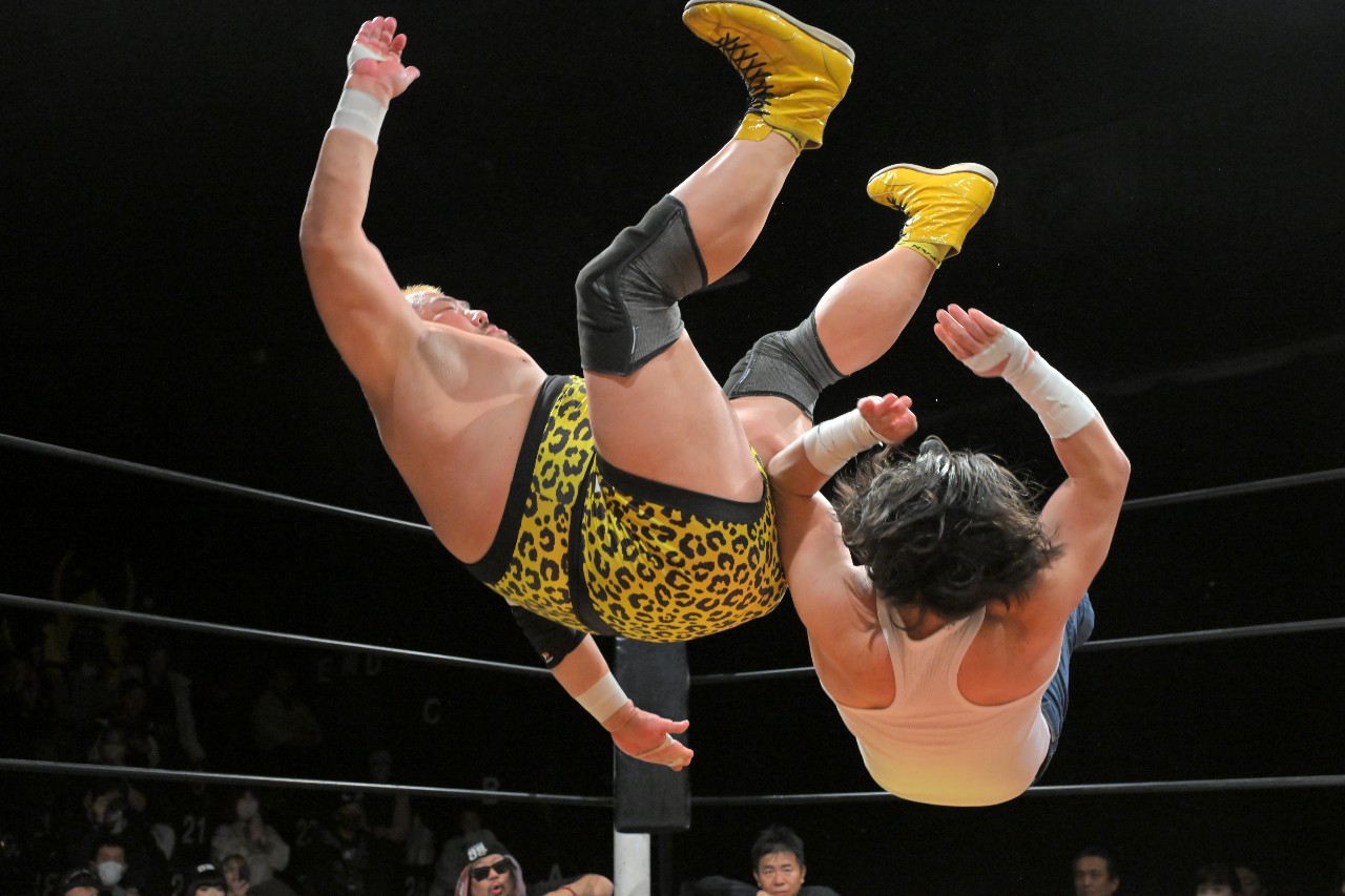 ガッツは大家を振り払ってチョップを連打。大家もエルボーバッド連打からローリング・エルボーを放つが、倒れず耐えたガッツが延髄切り。ガッツはロープに飛んでラリアットを放つが、これを避けてロープに飛んだ大家が炎のスピアー。会心の一撃を決めた大家がそのまま全力で押さえ込んでカウント3を奪取。大家が執念の王座戴冠を果たした。