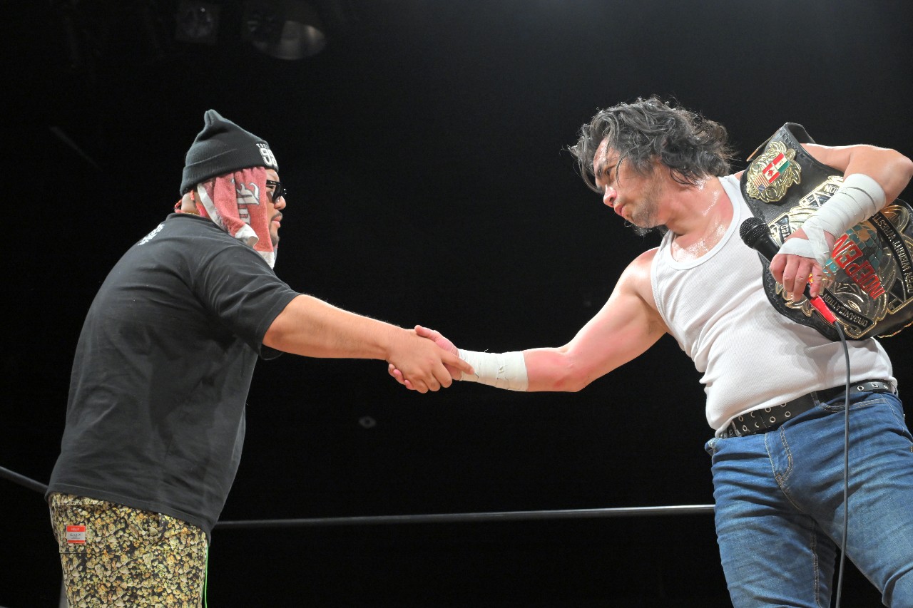 大家「ガッツ……ずっと、やってもう、四半世紀以上経つ。俺はお前を大切な仲間だと思ってる。今日、ガッツ、お前に勝ったからといって驕ることなく、俺は25周年記念、今年25周年で、それを前面に押し出してやっていくことを決めました。その第1戦目で、ガッツ、お前と試合ができて、タイトルマッチができて、なんとか勝つことができたけども!本ッ当に……発表して最初の相手で、お前、ガッツが良かったと思う。ありがとうッ!」