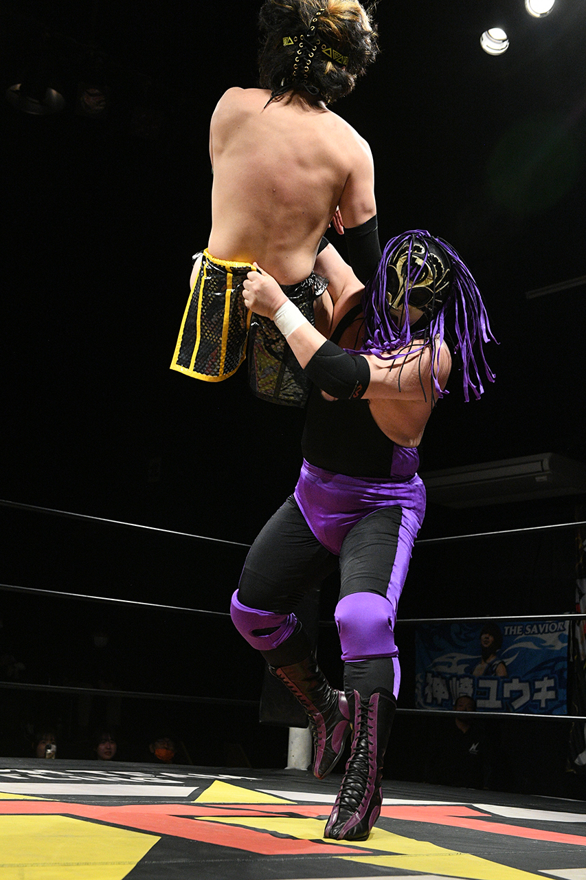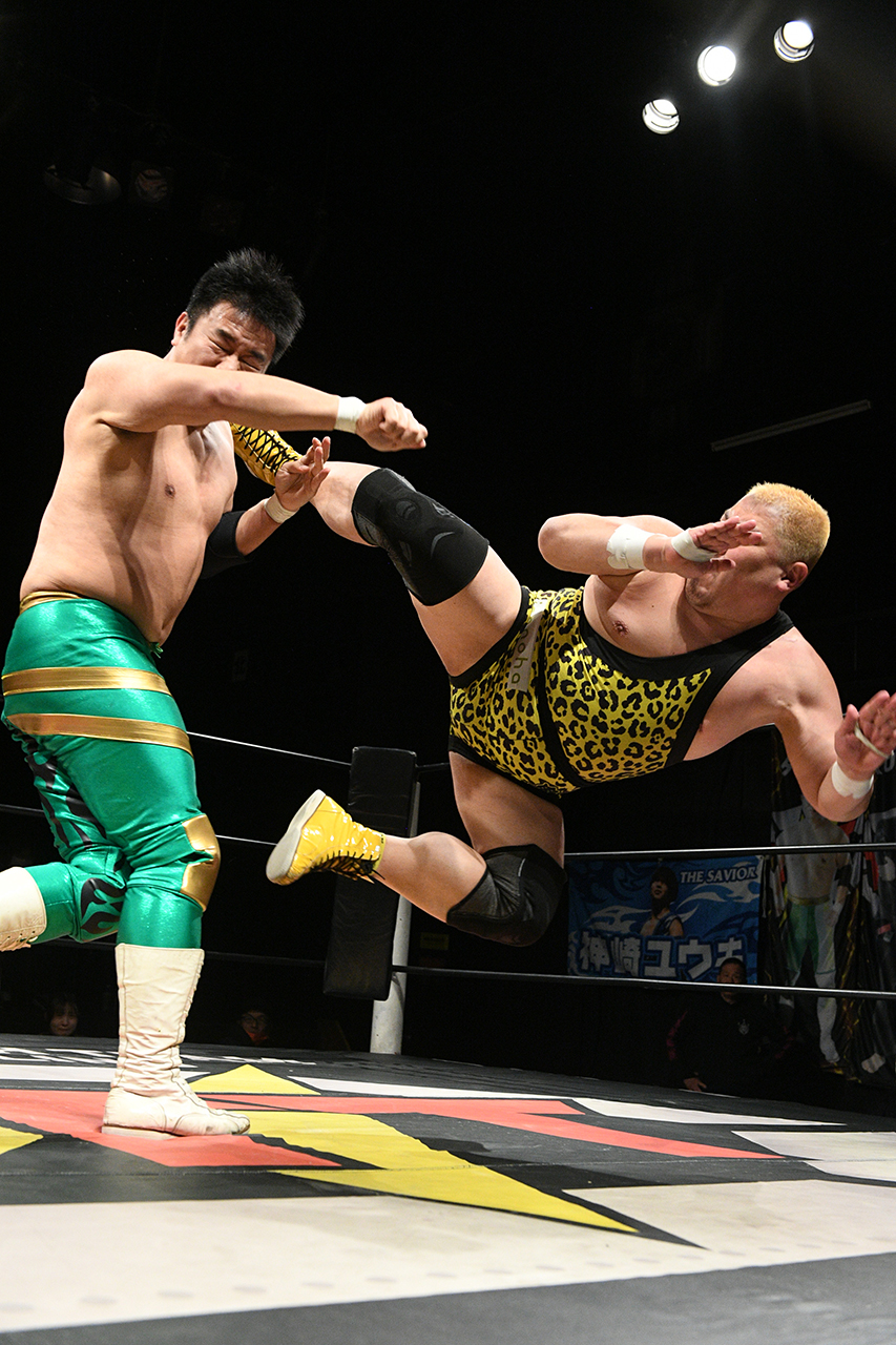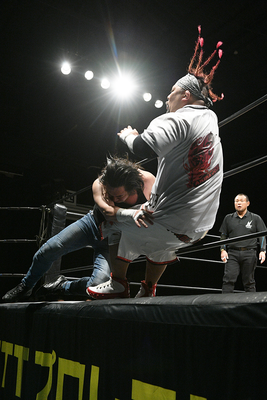 ダイスケは投げようとするが、耐えたガッツがボディブローから逆に担ぐも、ダイスケは着地してネックブリーカードロップからコーナーに登りフロッグスプラッシュ。フォールも2。