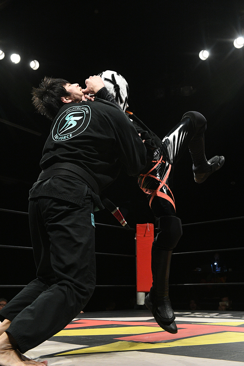 大家はコーナーに登りセカンドロープからのライダーキック。ストンピングからロープに振ろうとするが耐えた定がボディに膝蹴りからエルボー連打。ロープに振ろうとするが逆に定が振ってブラックホールスラムで叩きつける。