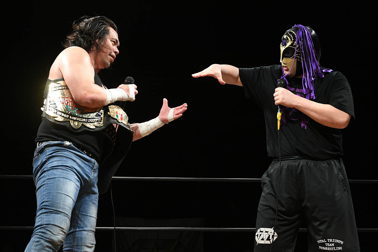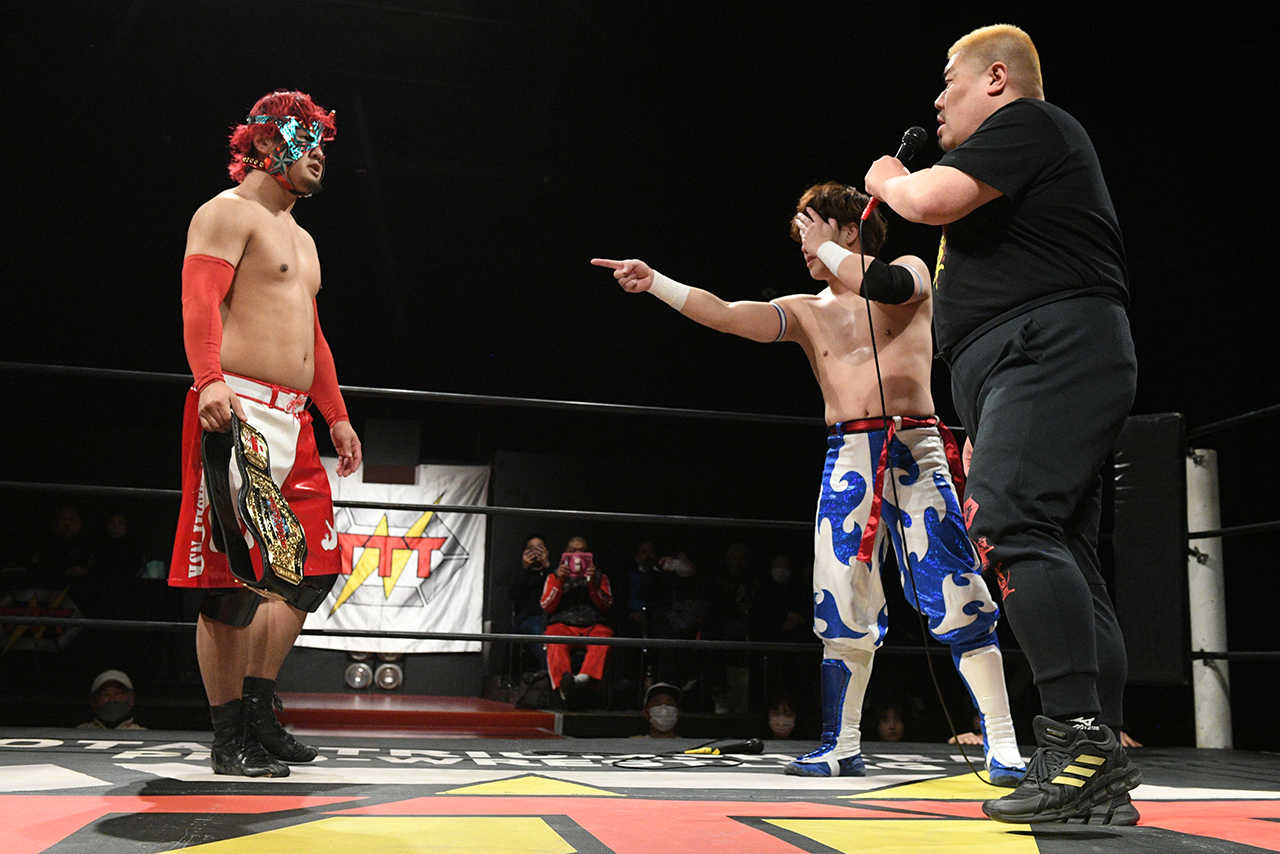 大家「おうしゃ!というわけで!来月4月19日、TTT新木場大会!TTT、トリプルティー認定 、インディー統一無差別級、大家健対マスクドミステリー決定だ!はい、しめようしめよう。お前達仲間だろ?みんな立て!いつものやつでしめるからな、いくぞー、おー、シングル、ダブル、トリプルティー、いいか?一回しか言わねーぞ、いくぞー!シングル!ダブル!トリプルティー!」