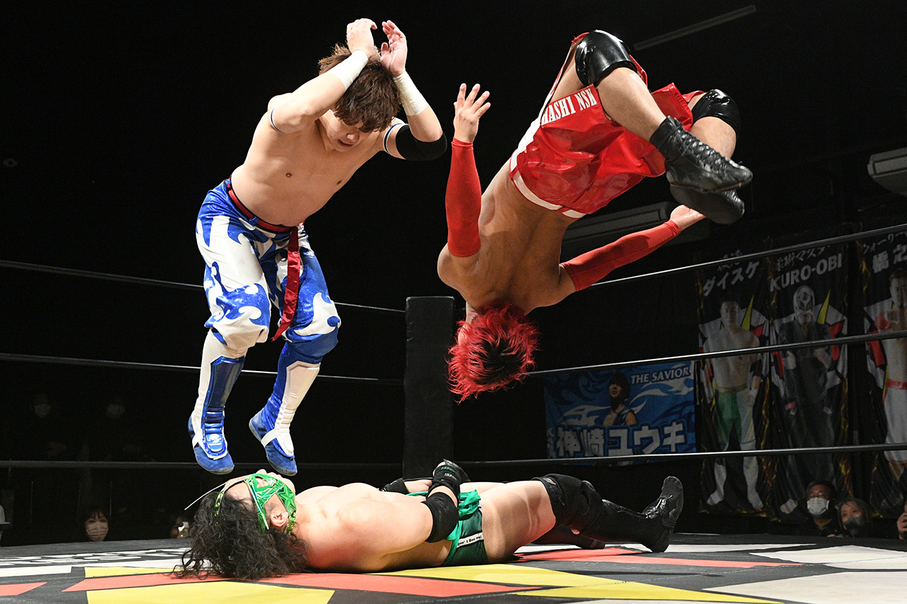 阿部がロープに飛ぶもツトムがスカしてバックを取り、3人でバックの取り合いから瀧澤がロープに飛んで2人まとめてクロスボディで倒す。